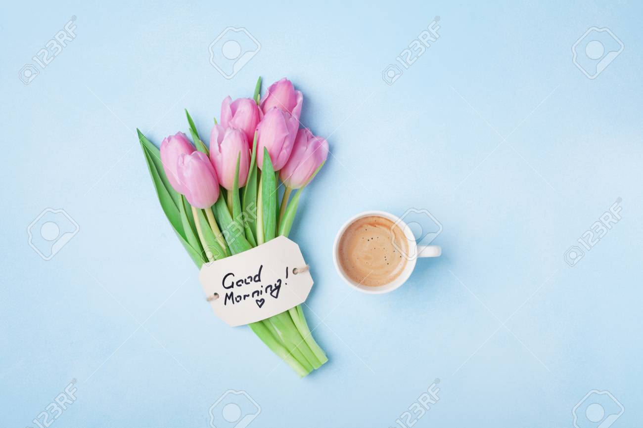 Cup Of Coffee, Pink Tulip Flowers And Note Good Morning On Blue.. Stock Photo, Picture And Royalty Free Image. Image 96169621.